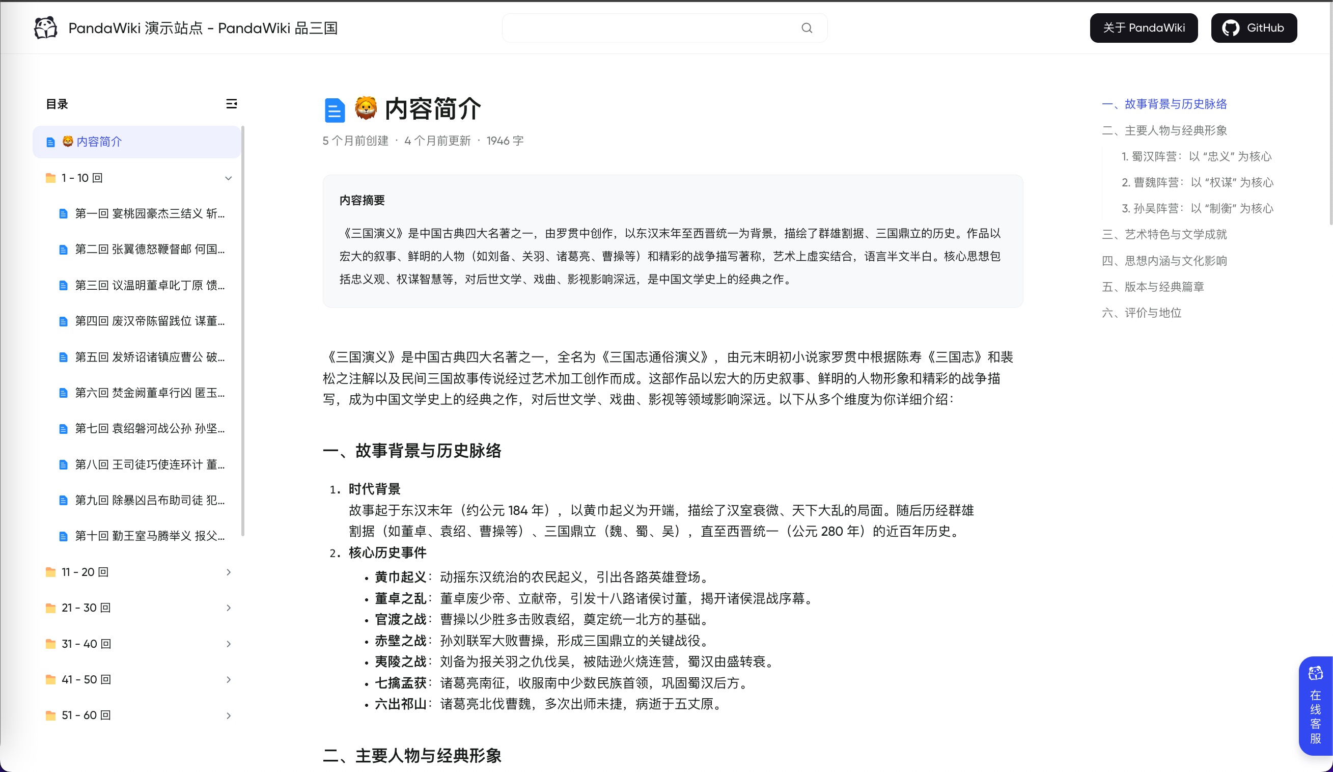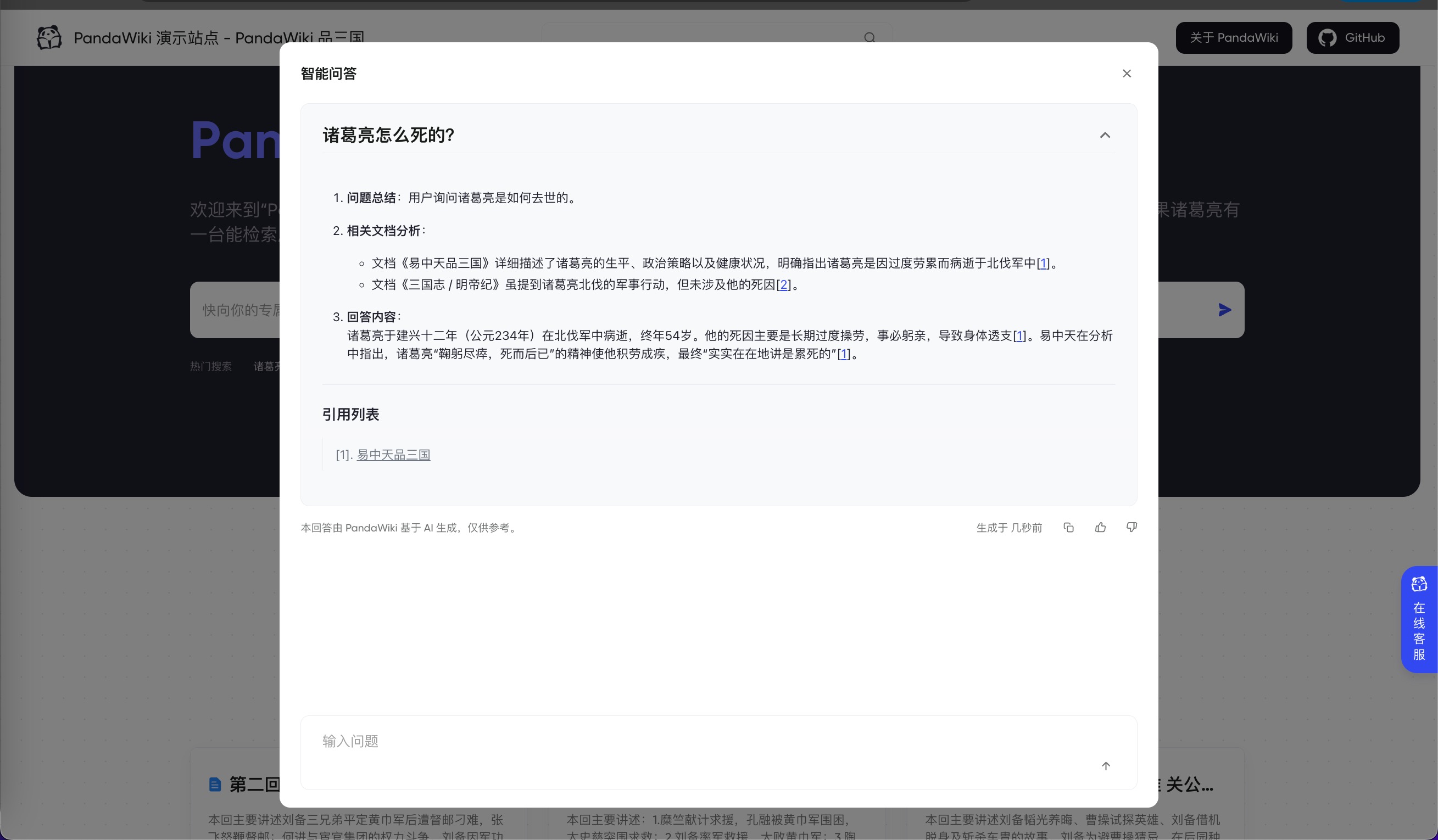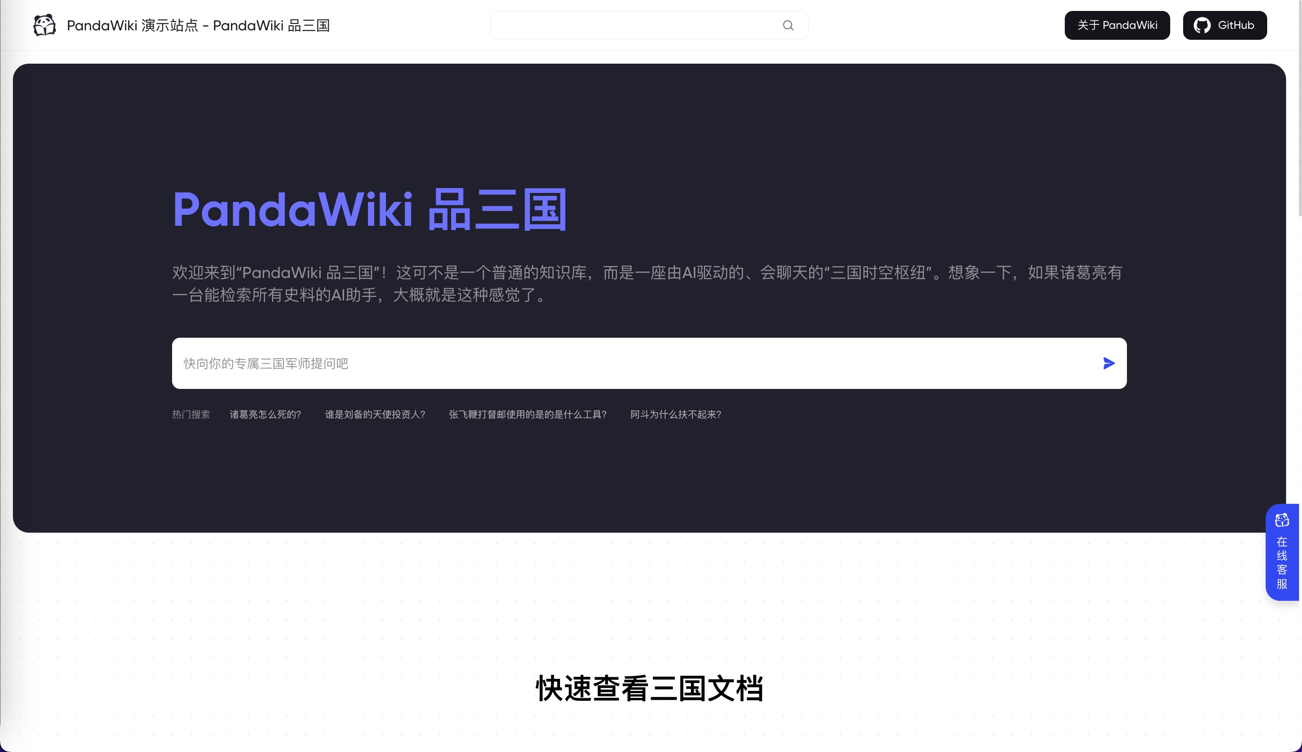 欢迎来到“PandaWiki 品三国”!这可不是一个普通的知识库,而是一座由AI驱动的、会聊天的“三国时空枢纽”。想象一下,如果诸葛亮有一台能检索所有史料的AI助手,大概就是这种感觉了。